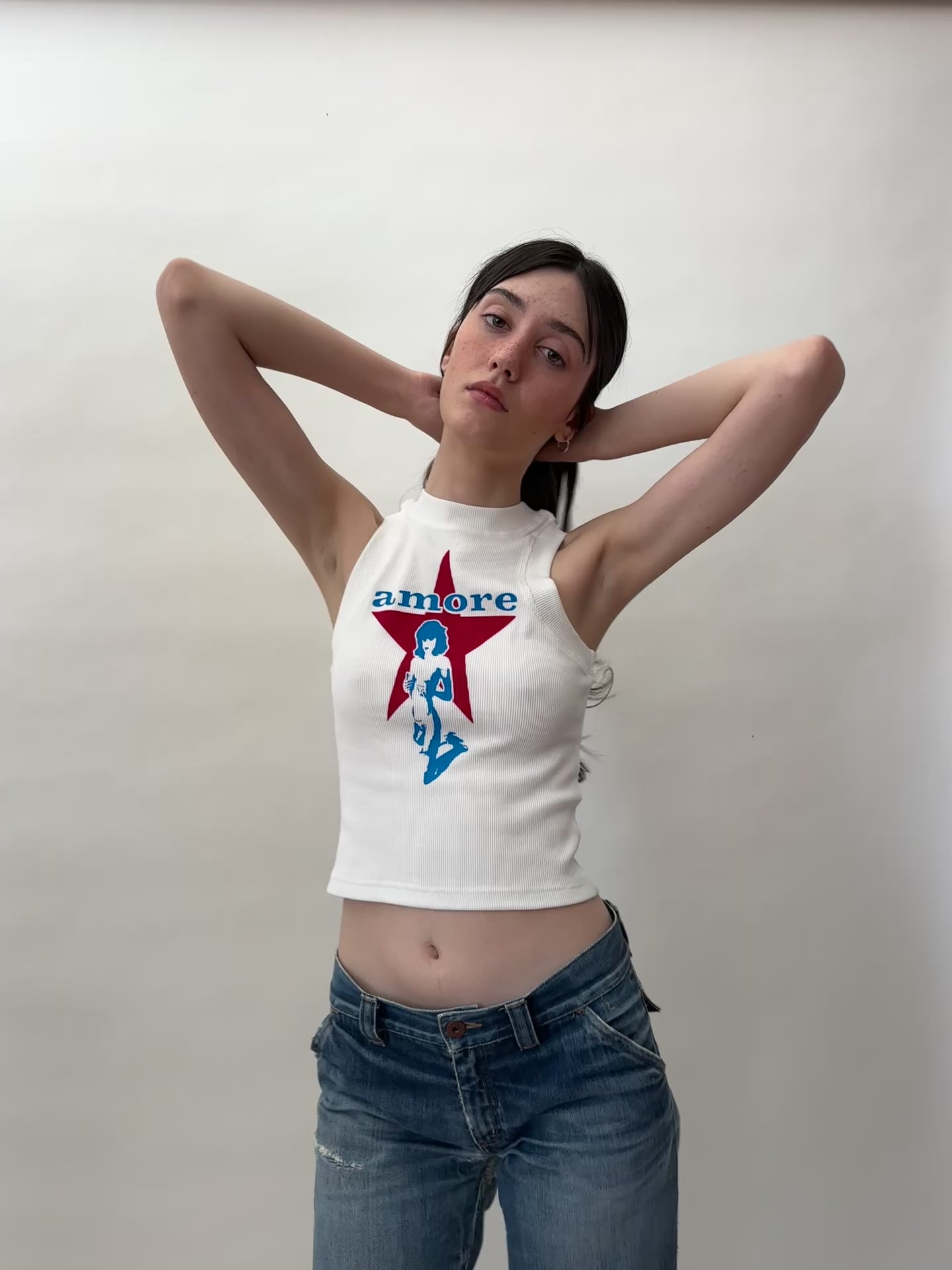 Made in Italy from ribbed white cotton stretch, this cropped slim-fit tank features a bold “Amore” print paired with a retro star graphic. Designed for playful romance and reckless abandon, it’s a statement piece with effortless wearability.