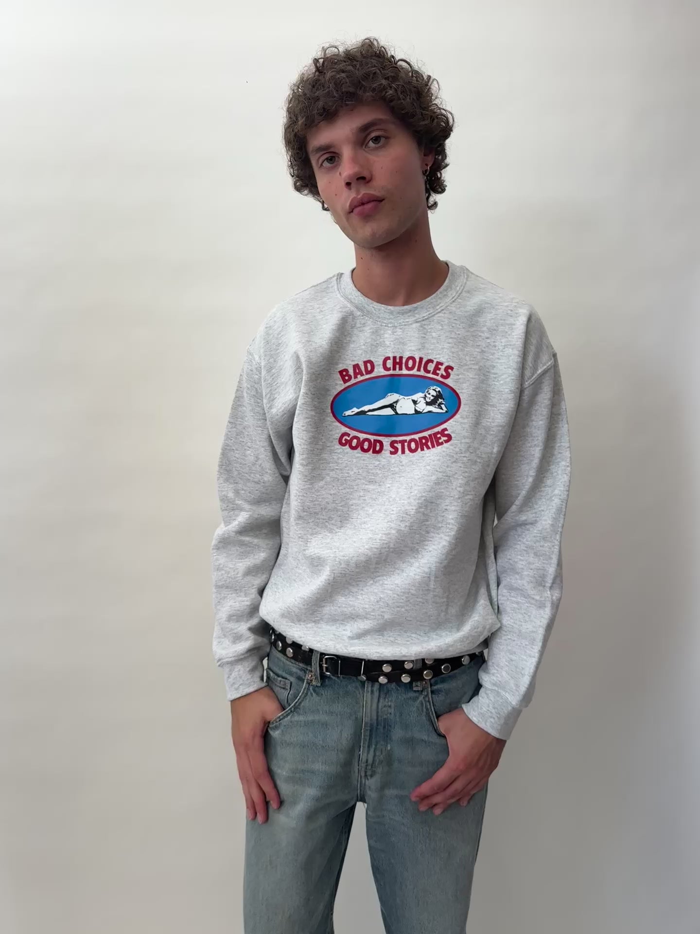 Because sometimes the best stories start with the worst decisions. The Bad Choices Good Stories Grey Crewneck delivers premium comfort with a streetwise edge. Crafted in Italy from a cotton-poly mix (260 gr.), it’s as cozy as your questionable life choices—but way more stylish.