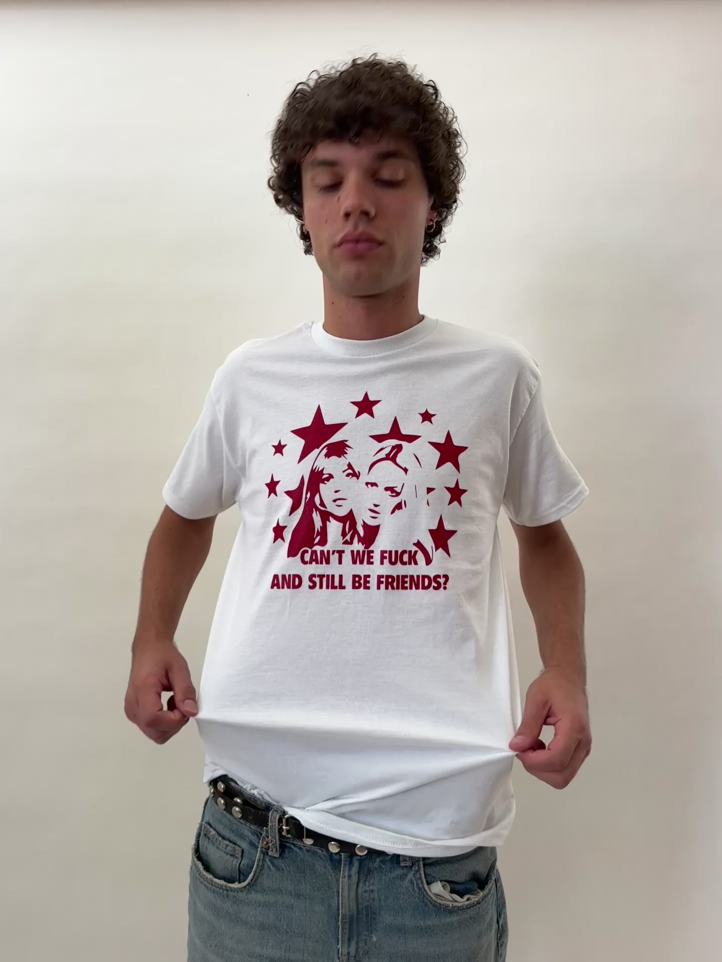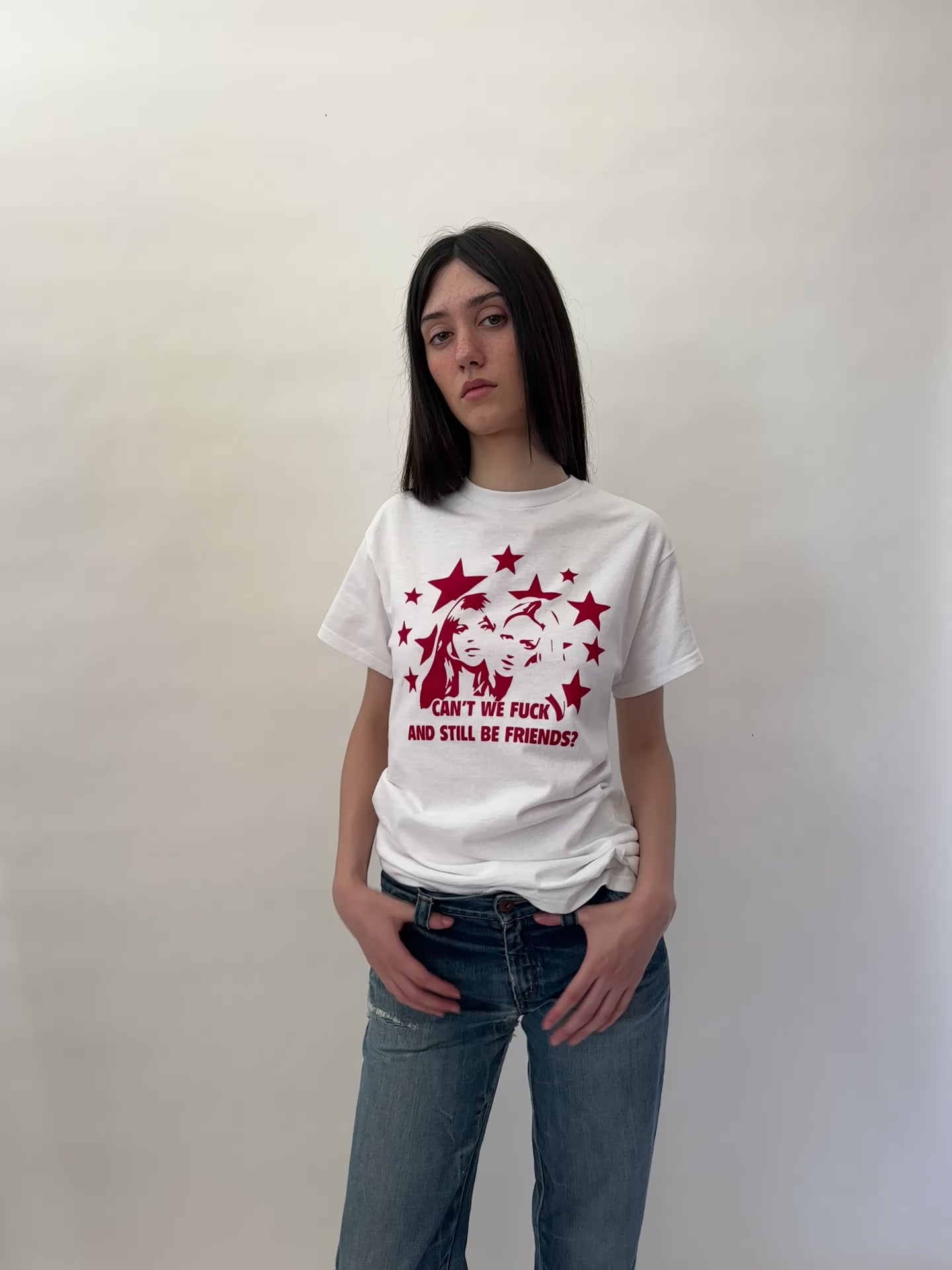 Crafted from 100% cotton in Italy, this white tee features a bold red screen print graphic with the slogan “CAN’T WE FUCK AND STILL BE FRIENDS?” framed by stars and portraits. A statement piece that turns a basic silhouette into a conversation starter.