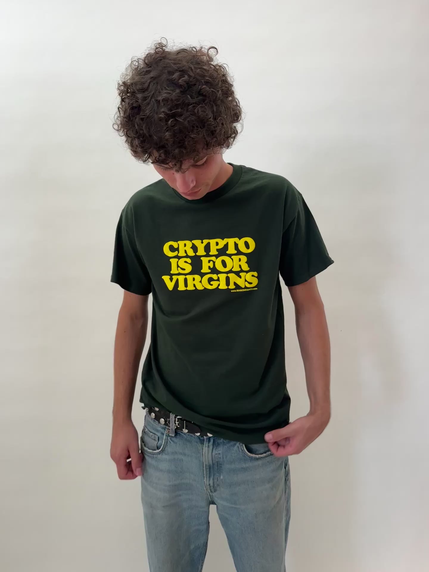 Made in Italy from 100% premium cotton, this dark green tee makes a bold statement with its yellow screen print slogan: “CRYPTO IS FOR VIRGINS.” Designed in a regular fit with soft fabric, it’s casual yet provocative—streetwear with a punchline.