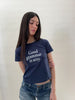 Inspired by retro logos, this black baby tee blends soft cotton stretch with a bold blue print at the center. Cropped and fitted for everyday chaos.