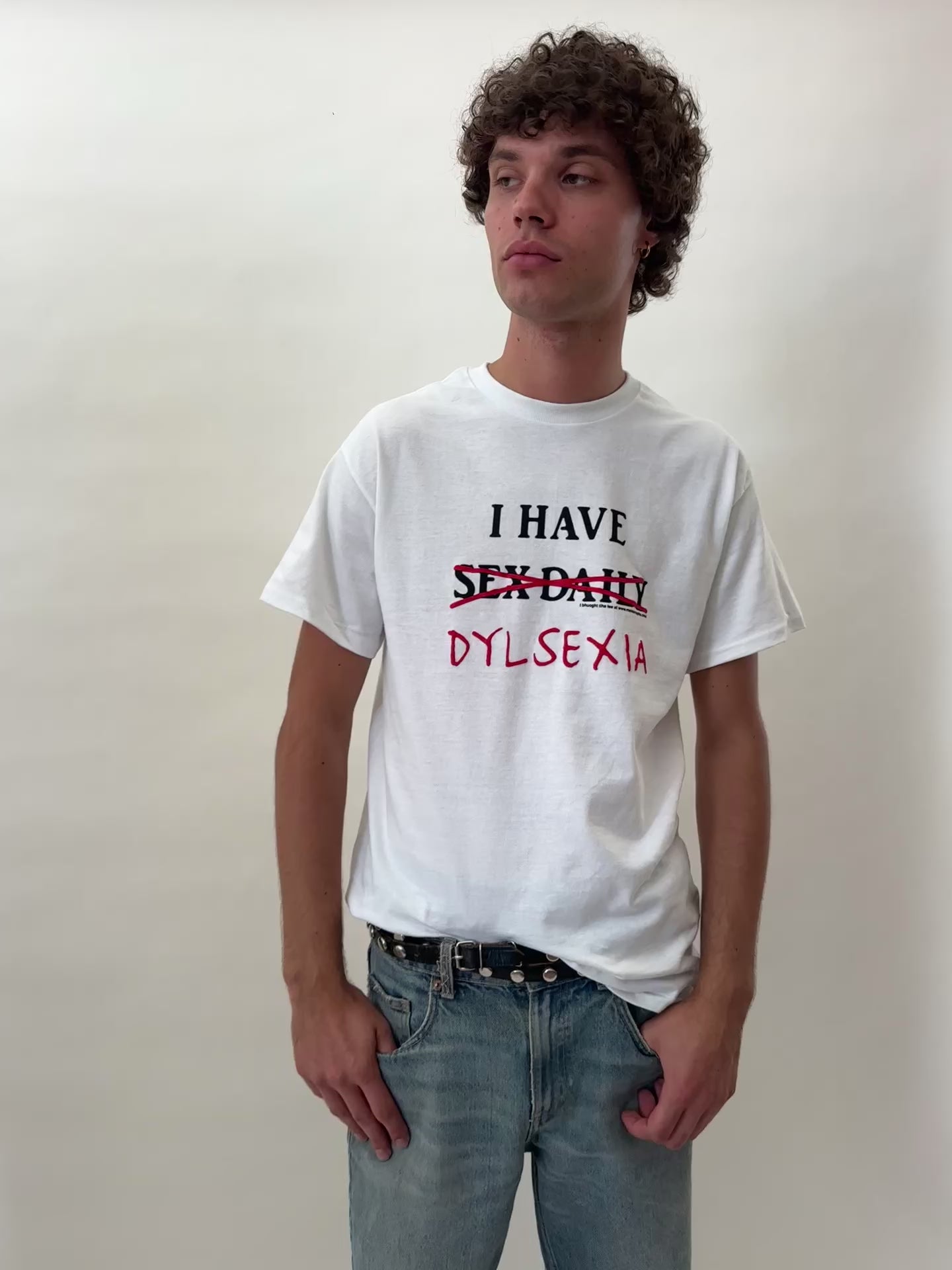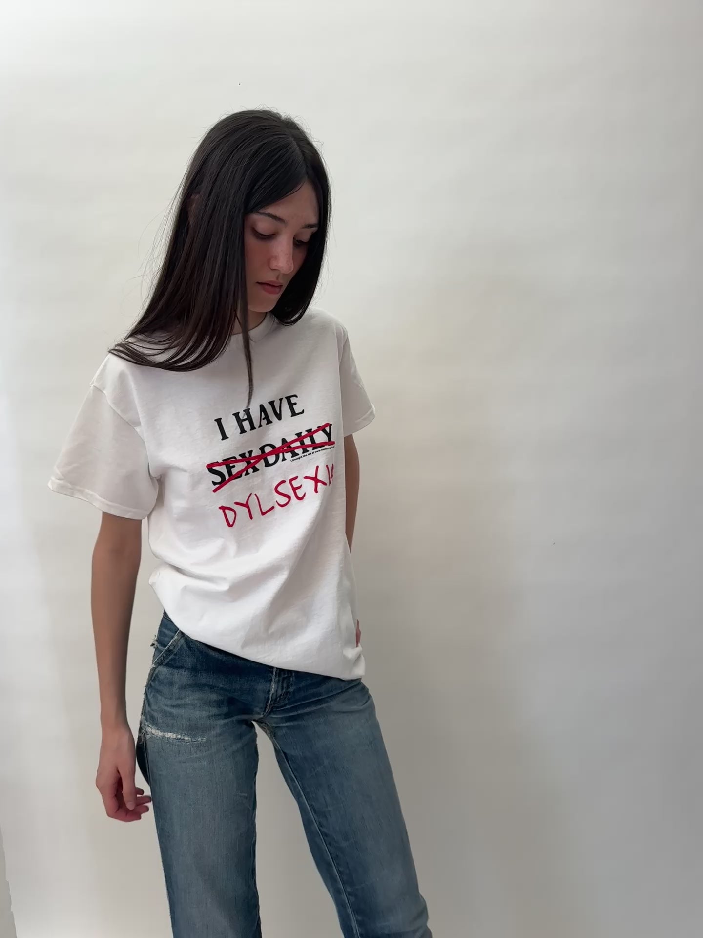 Made in Italy from 100% premium cotton, this white tee turns a simple slogan into a cheeky statement. The bold black and red front print plays on words with “I HAVE SEX DAILY” crossed out and replaced with “DYLSEXIA,” bringing irony and attitude to a classic cut. Designed for everyday wear with a regular fit and soft hand feel.