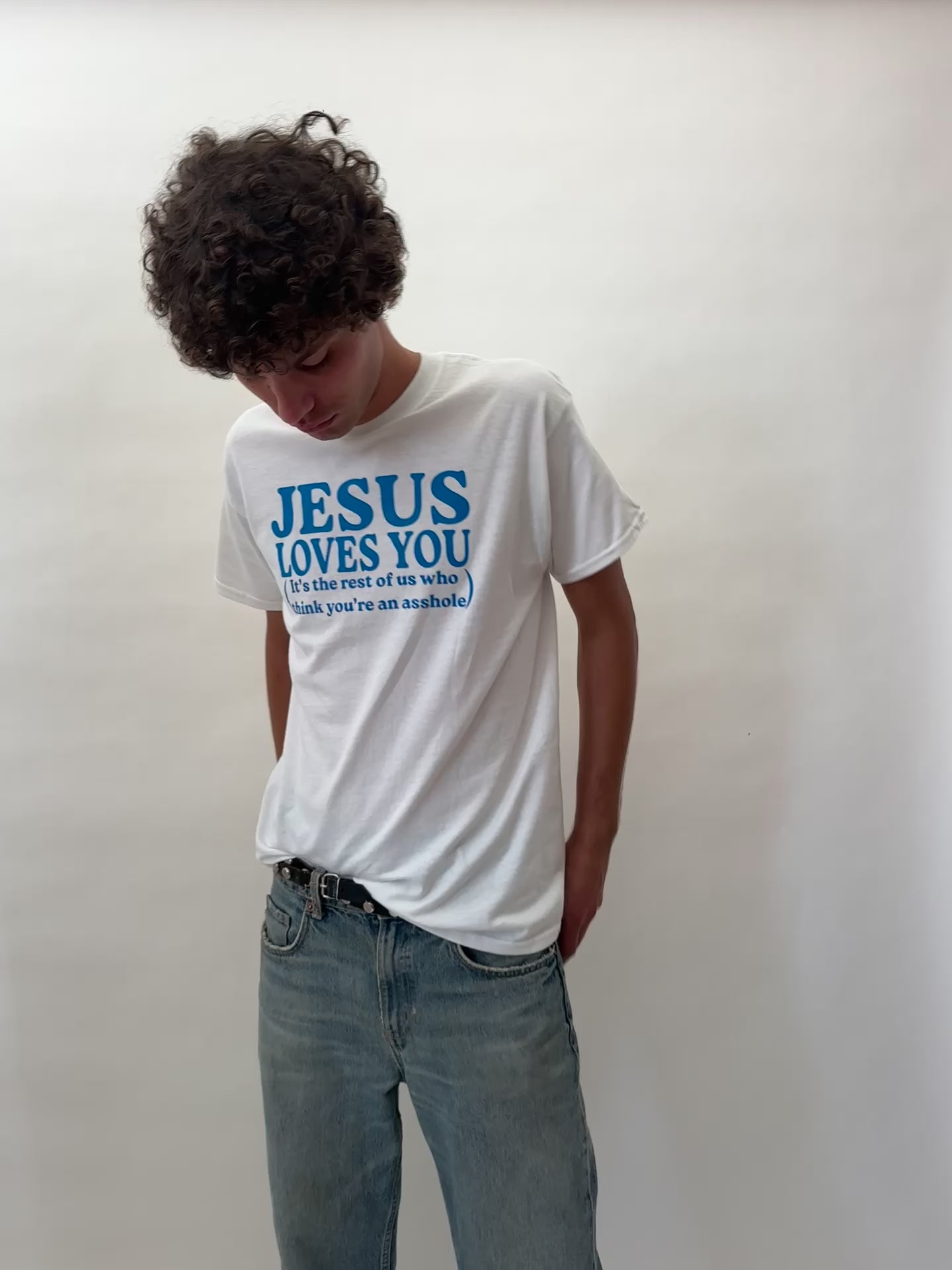 Made in Italy from 100% premium cotton, this white tee pairs irreverence with simplicity. The bold blue screen print reads “JESUS LOVES YOU (It’s the rest of us who think you’re an asshole)”, making it a provocative statement piece with a clean silhouette. Designed with a regular fit and soft hand feel, it’s ideal for everyday wear with attitude.