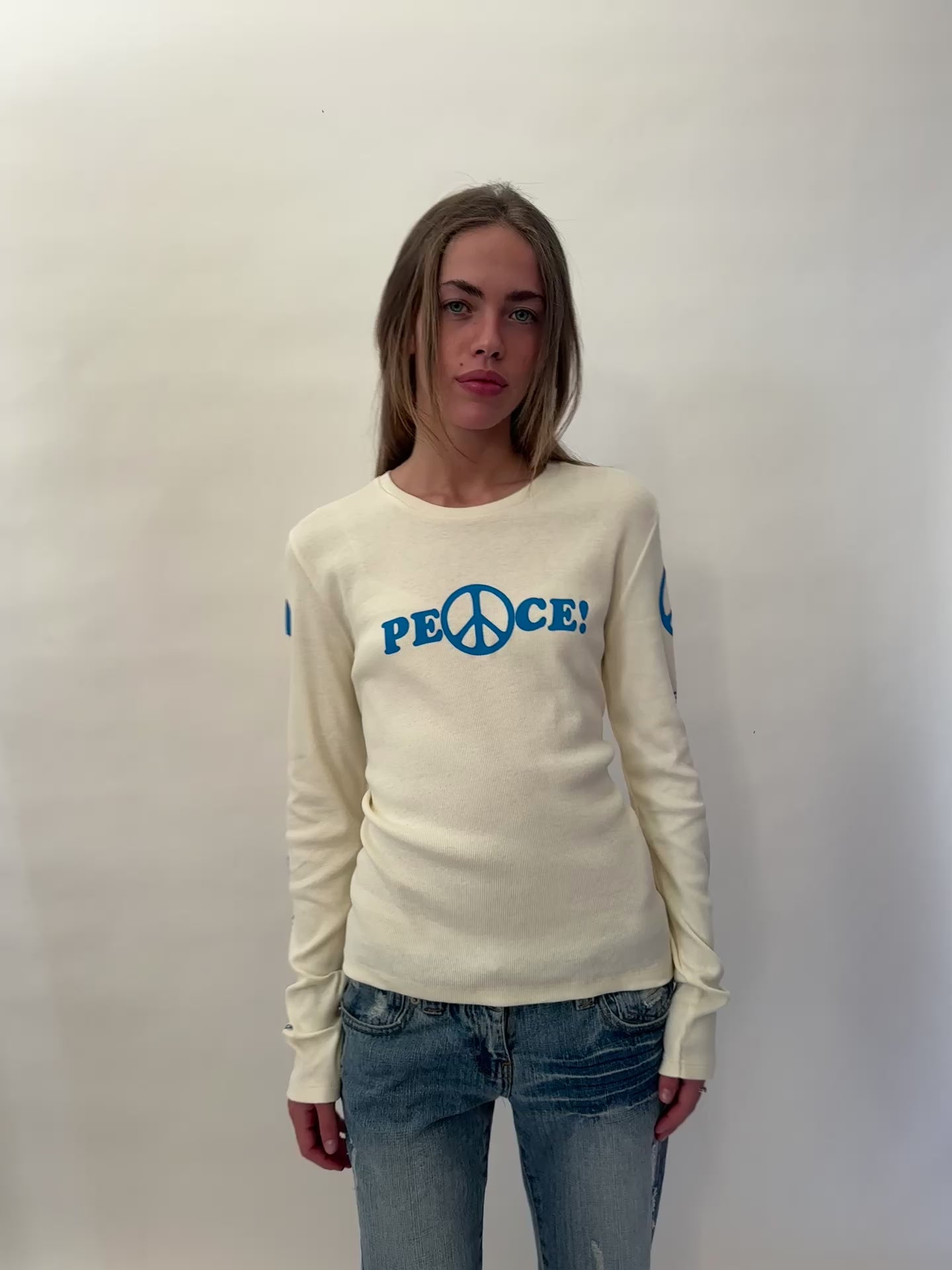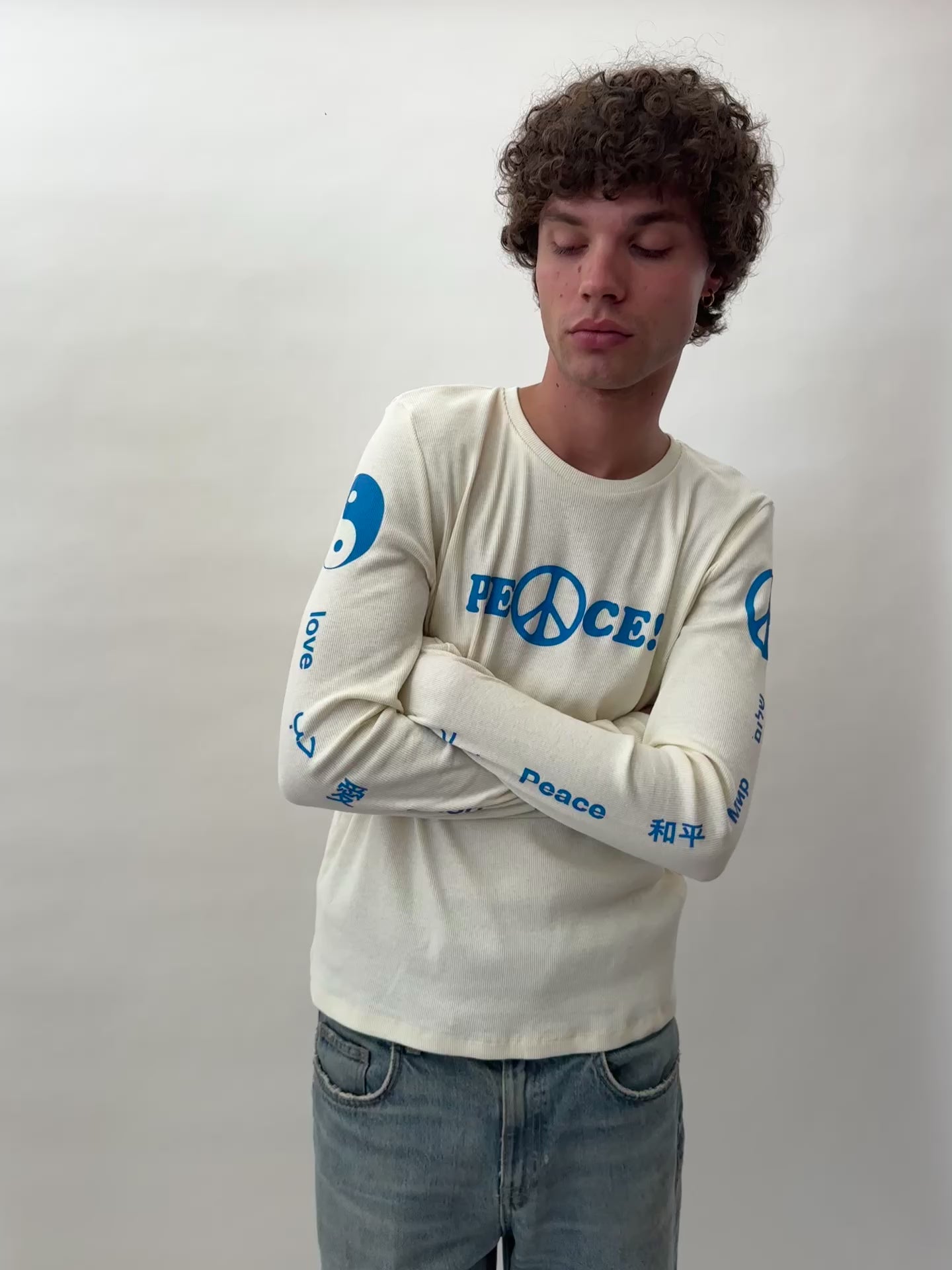 Made in Italy from soft cotton with a touch of elastane for stretch, this longsleeve is all about balance—comfort with a cause. The bold “Peace!” print gives a voice to the simplest, strongest statement out there. With a medium weight (180 gr.) and a versatile cut, it’s perfect solo or layered, for those who know that peace will always be in style.