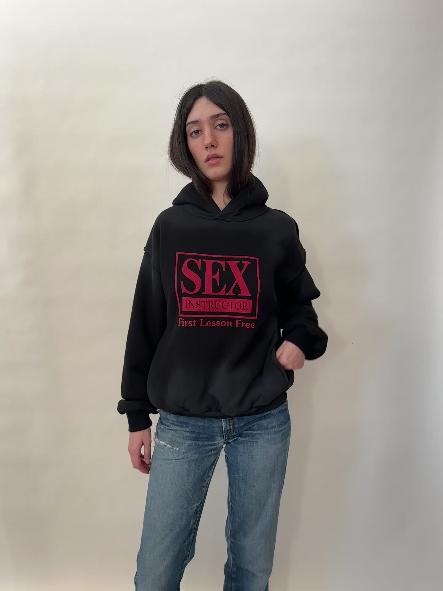 Made in Italy from a premium blend of 80% cotton and 20% polyester, this hoodie offers softness, warmth, and durability. The black base is contrasted by a striking red front print reading “SEX INSTRUCTOR – First Lesson Free”, giving classic streetwear a provocative edge. Featuring a roomy hood, ribbed trims, and a relaxed fit, it’s perfect for everyday wear with a standout twist.