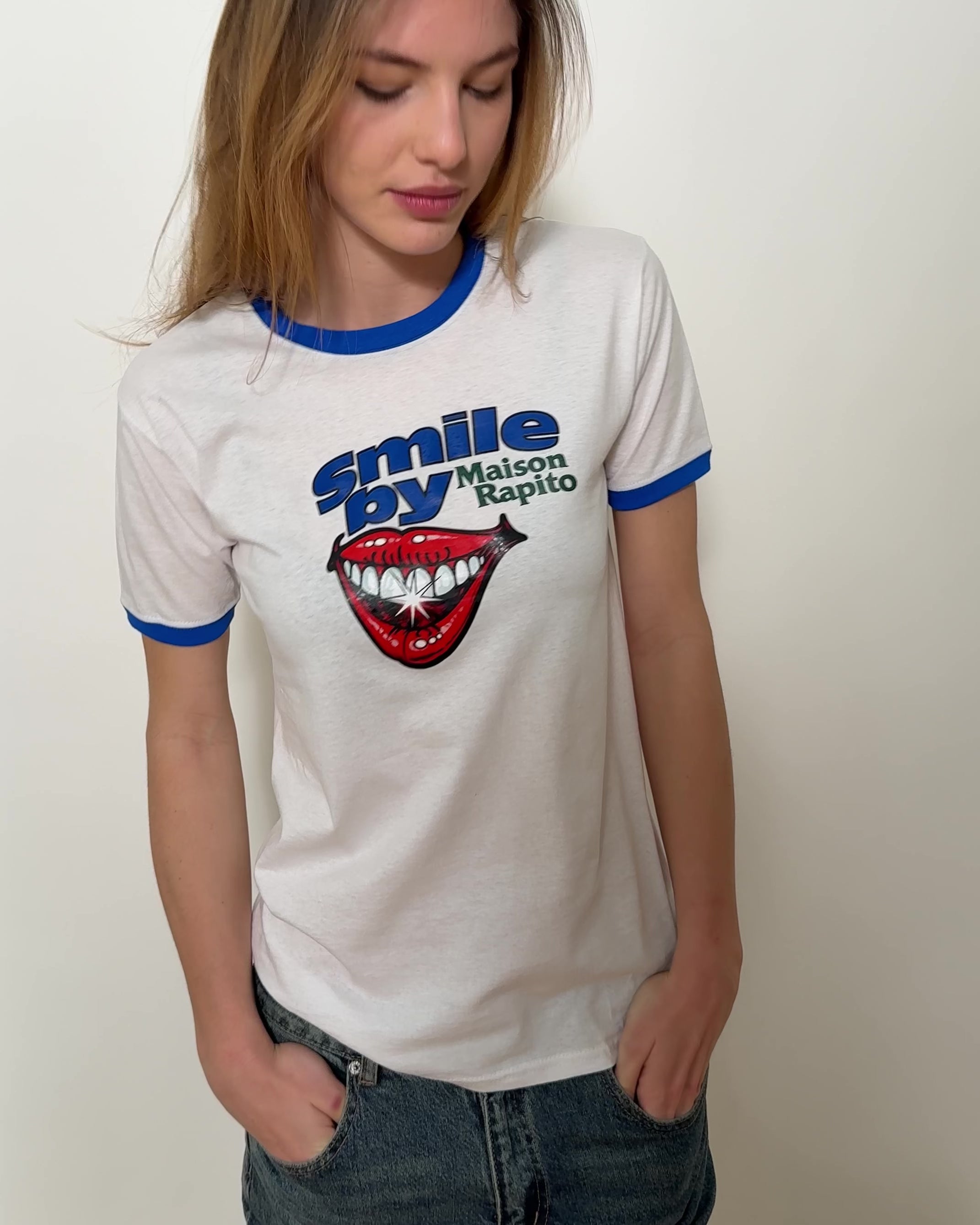 Printed in high-quality screen print made to last, it’s the kind of piece you’ll wear to concerts, wash a hundred times, and maybe never get back after lending it to the wrong person. Made in Italy, built to stay in rotation. The SMILE BY MAISON RAPITO TEE looks harmless at first, then not really.